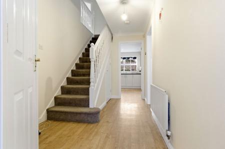 Wooden obscure glass door into an entrance hall with ceiling light point. Radiator. Under-stair storage cupboard. Wood effect laminate flooring.