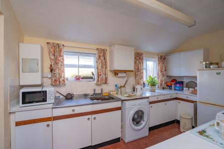 Fitted with a range of drawer and cupboard base units with worktop and matching wall units. Space and connection point for electric cooker. Stainless steel sink unit. Glazed windows to rear. Tiled splashbacks, ceiling light point. Airing cupboard. Door to rear porch and door to