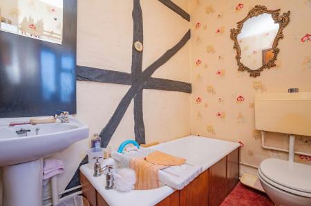 Fitted with a low level WC and pedestal wash hand basin, panelled bath, ceiling light point, exposed wall timbers. Obscure glazed window.