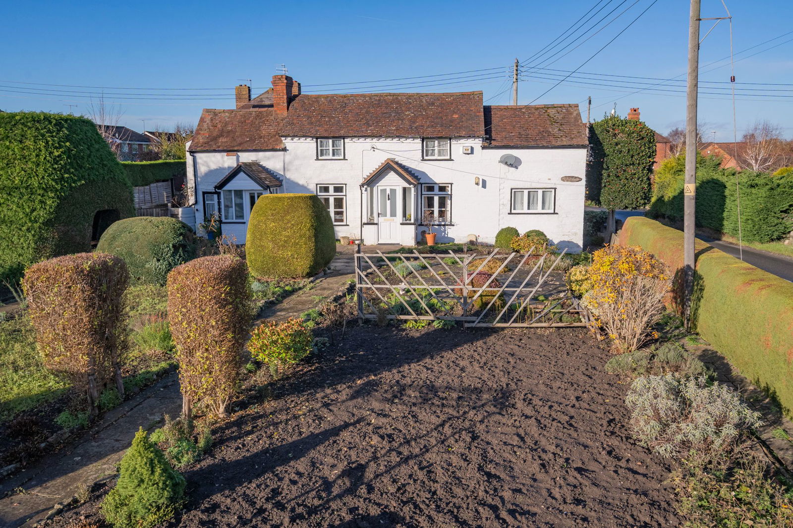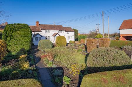 No doubt one of the key selling points of the property are the generous grounds which mainly lie to the front of the house and are enclosed by a hedged perimeter with gated pedestrian access either from the Hereford road or from Sherridge Lane. From here paths lead through the generous foregarden which at one point was mainly given over to a productive vegetable garden but now is interspersed with shrubs and plants.