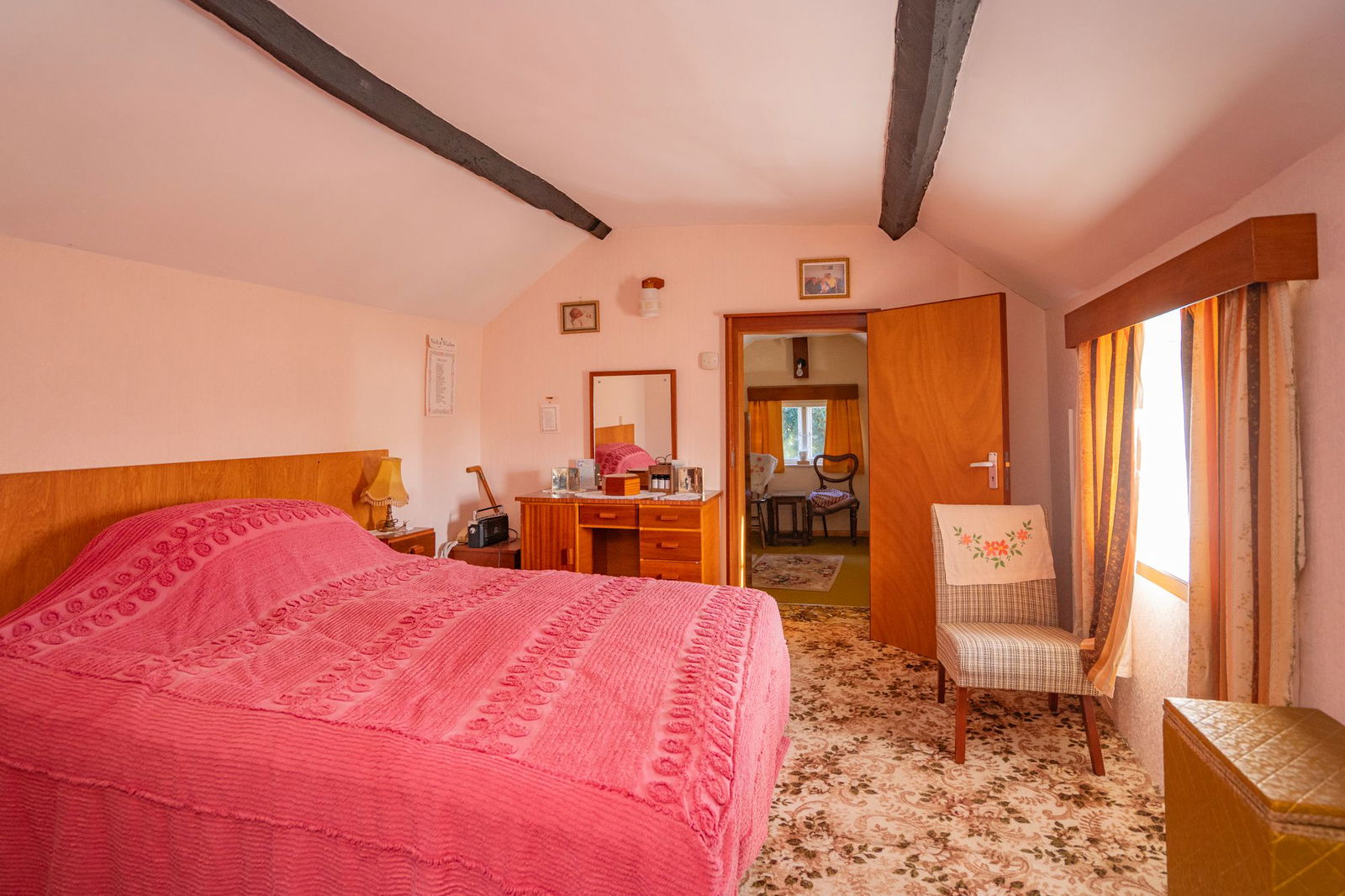 Being a through double bedroom with exposed ceiling timbers and glazed window to front. Door to