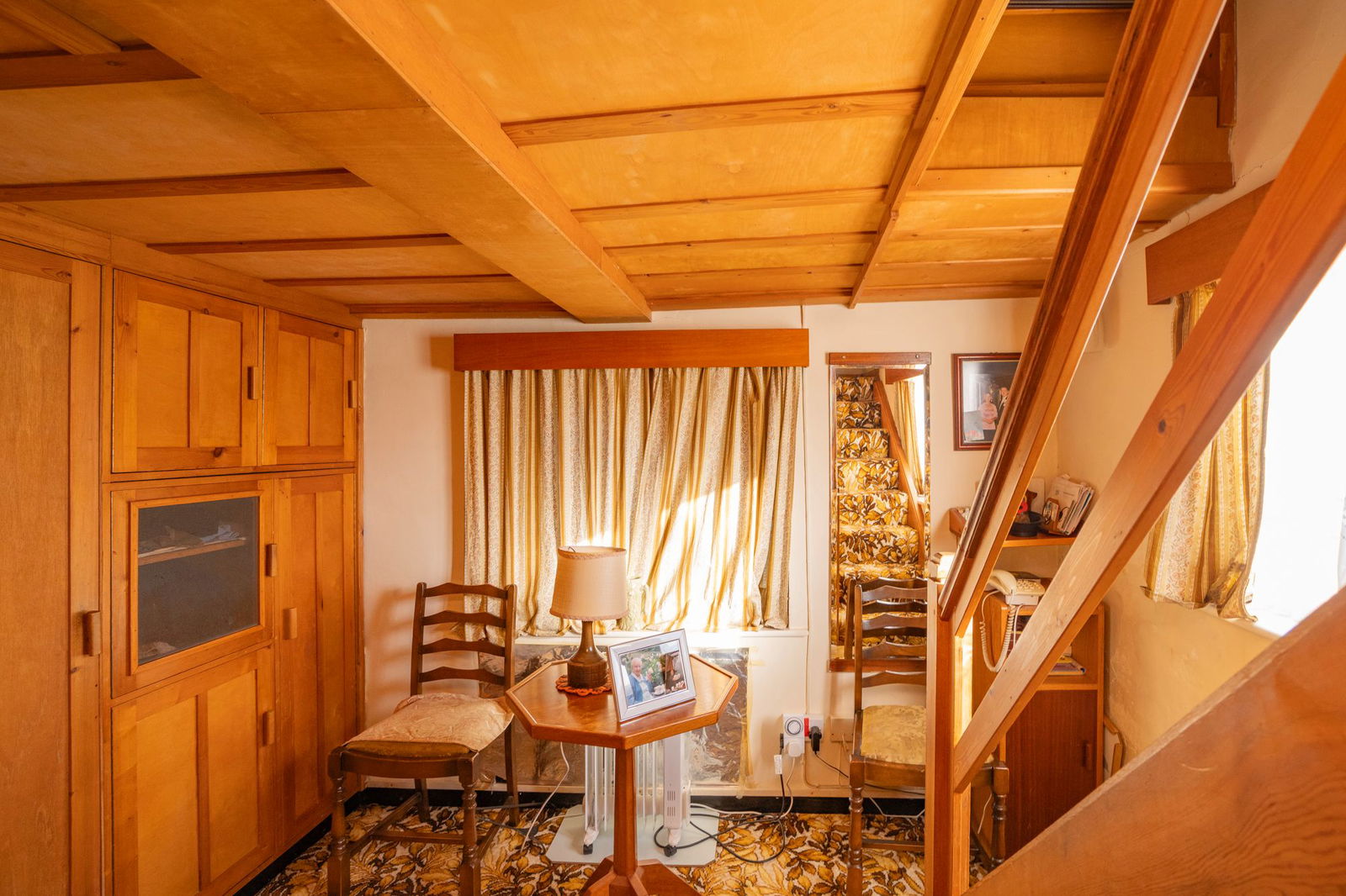 Windows to front and side, fitted cupboards to one wall, wall light point and staircase to first floor.