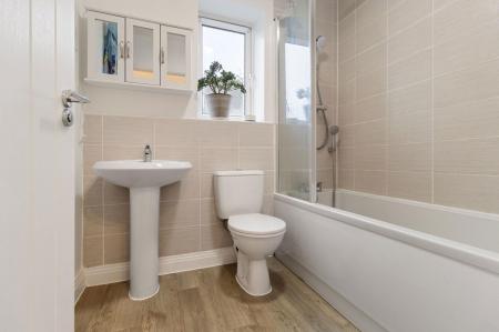 Laminate flooring, partially tiled walls, ceiling light fitting, extractor fan, pedestal wash hand basin, close coupled WC, panelled bath with mains powered shower connected, obscure double glazed window to side, chrome heated towel radiator and shaving point.