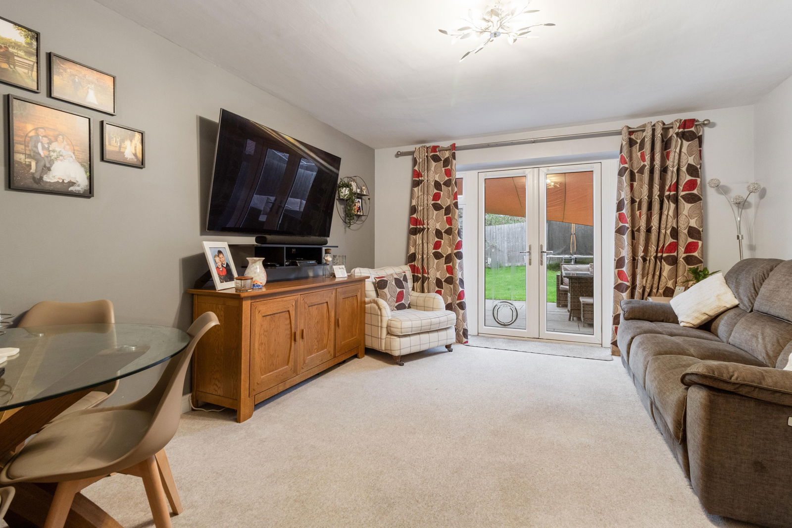 A sociable family space, double glazed French doors giving access to the rear garden. Carpet, ceiling light fitting, space for table, storage cupboard understairs, radiator.