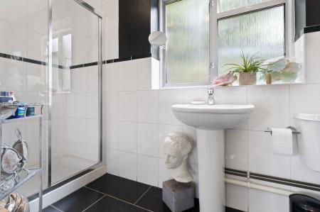 Tiled flooring, obscured double glazed window, two ceiling light fittings, extractor fan, low level WC, wash hand basin, large shower cubical with dual head shower, heated towel rail, storage cupboard with combi boiler and lagged hot water cylinder.
