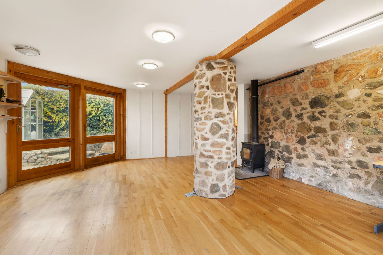 Flexible space suitable for a home office / studio. Wood flooring. Double glazed windows and doors opening onto the garden terrace. Ceiling lights.  Woodburning stove with venting above providing heat to both the garden room and living room above.