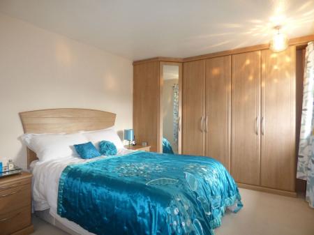 Double glazed window. Range of fitted bedroom furniture including wardrobes to one wall with hanging and shelf space and matching bedside tables. Ceiling light point, radiator. Door to