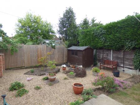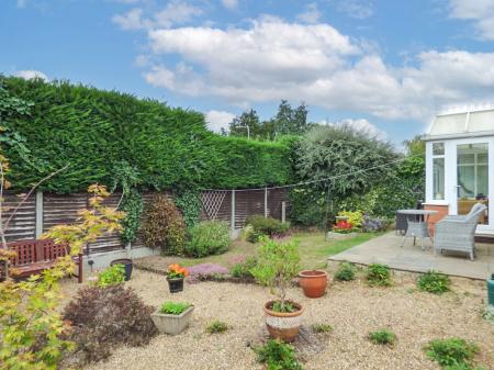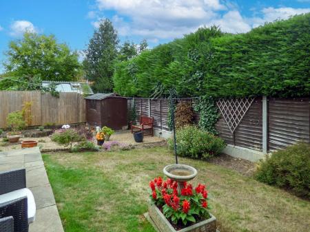 Extending away from the property is a paved patio seating area leading to a lawn with planted shrub beds. To the left of the patio is an easy to maintain stone chipped area with planted beds and wooden SHED. The garden is enclosed by a fenced and walled perimeter with gated pedestrian access to front.