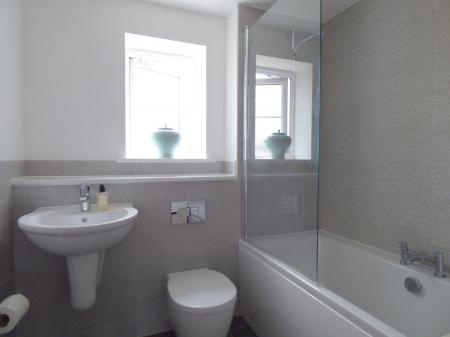 Fitted with a white suite comprising a low level WC, wash hand basin, panelled bath with mixer tap and thermostatic controlled shower over.  Inset LED spot lights, ceiling mounted extractor fan and wall mounted heated towel rail.  Splash backs and floor in complementary tiling.