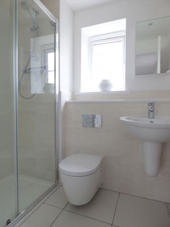 Fitted with a modern white suite consisting of a close coupled WC, wash hand basin, shower enclosure with thermostatic controlled shower over.  Inset ceiling spot lights, ceiling mounted extractor fan, obscure double glazed window to rear.  Wall mounted heated towel rail.  Tiled splash backs and flooring in complementary ceramics.