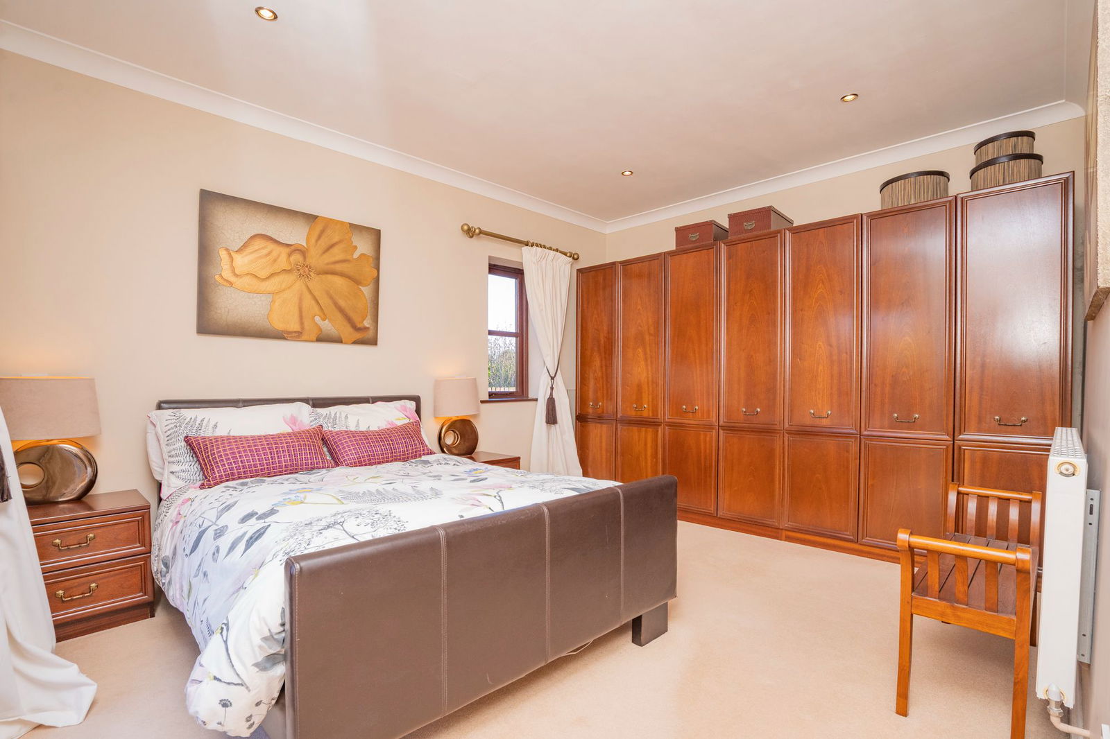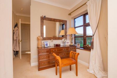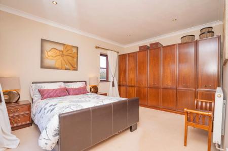 Double glazed windows overlook the formal garden to the views beyond.  Inset ceiling spotlights, radiator and coving to ceiling.  Entrance to en-suite (described later) and two steps lead down to