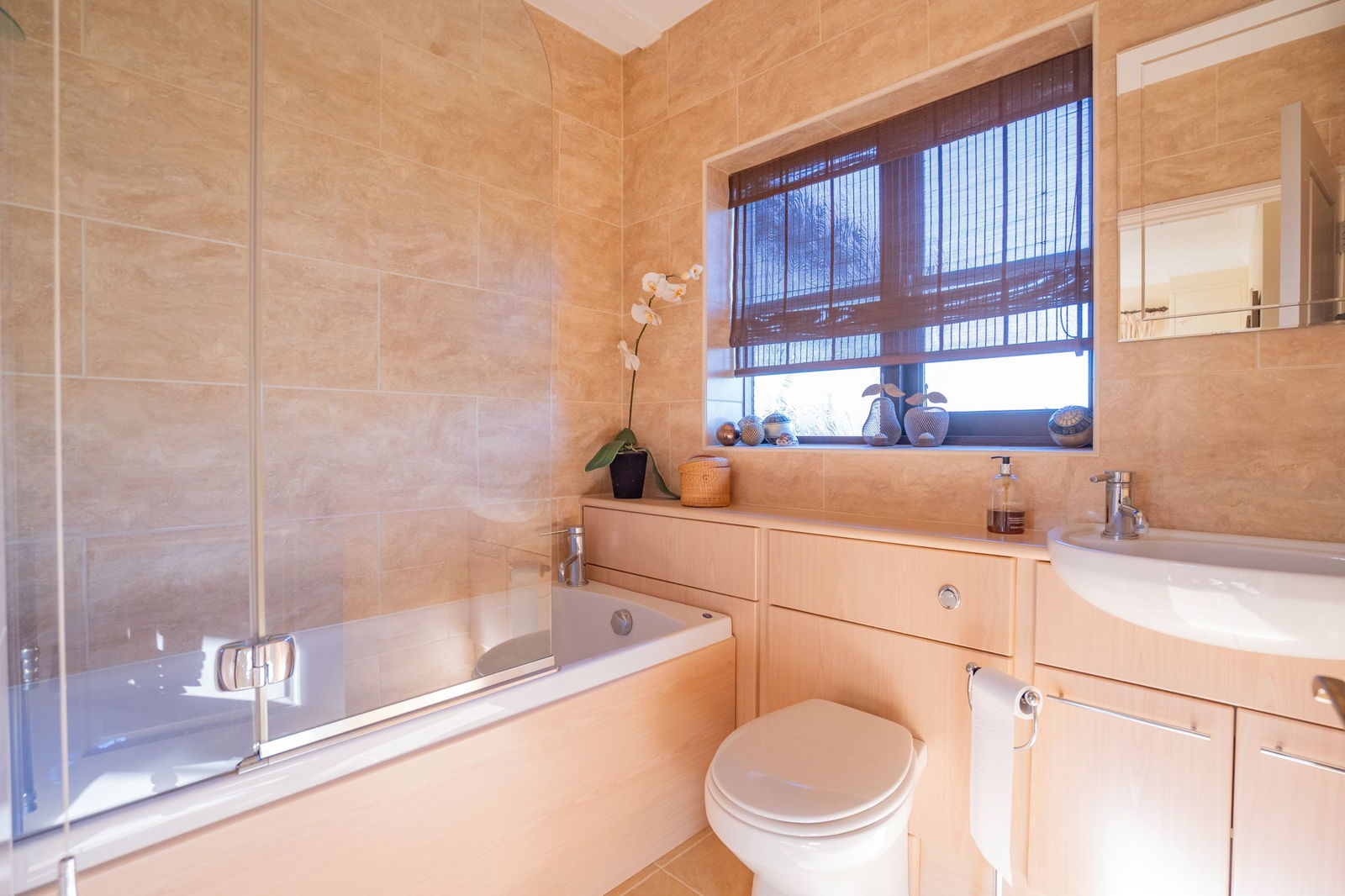 Fitted with a close coupled WC and vanity wash hand basin with mixer tap and cupboard under, panelled bath with mixer tap and thermostatic controlled shower over.  Inset downlighters one of which incorporates an extractor fan.  Obscured double glazed window to rear, wall mounted chrome heated towel rail and floor and walls finished in tiling.