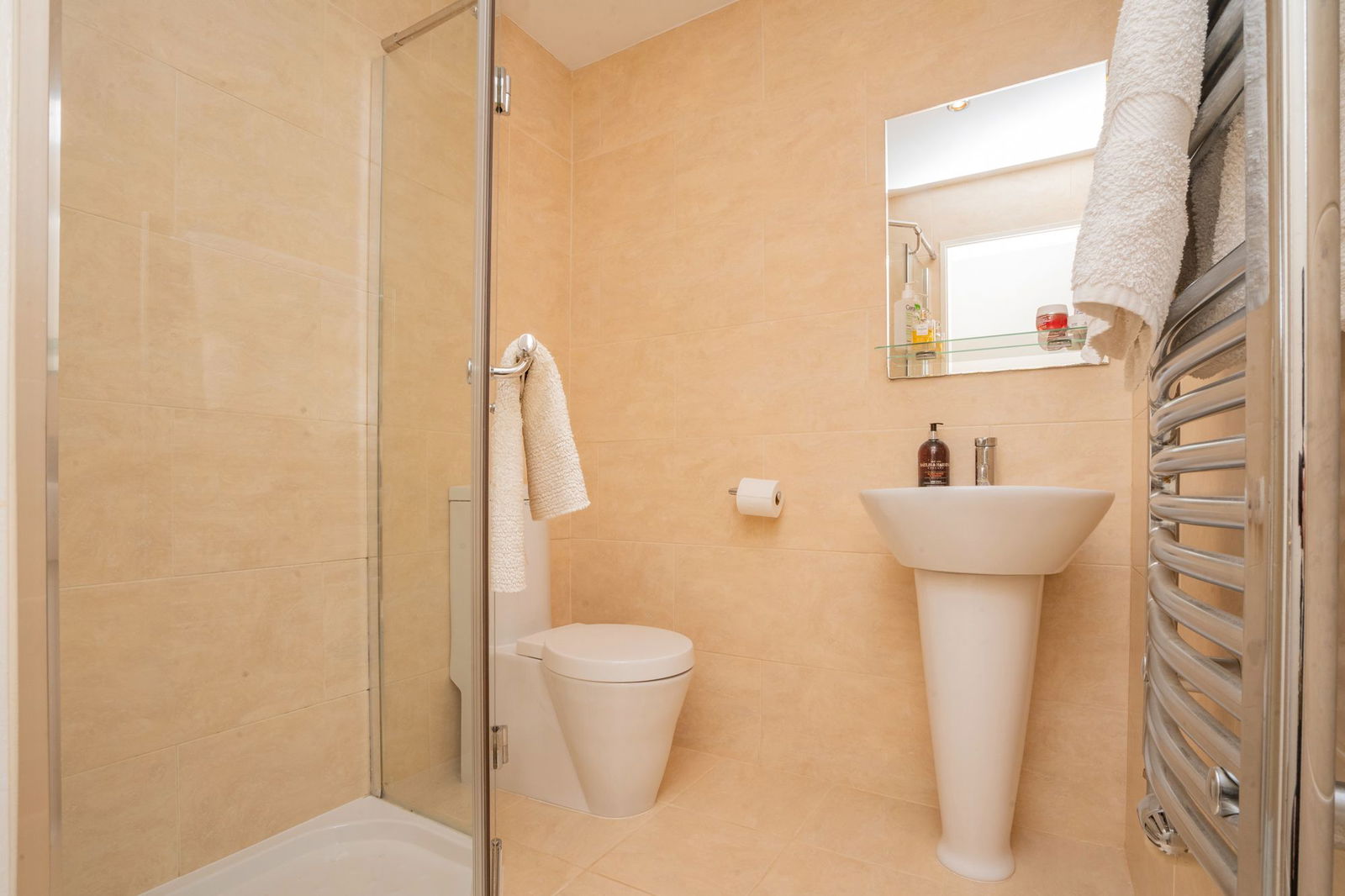 Fitted with a modern low level WC and white pedestal wash hand basin with corner shower enclosure with thermostatic controlled shower over.  Inset ceiling spotlights and wall and floor finished in complimentary tiling.  Chrome wall mounted heated towel rail.