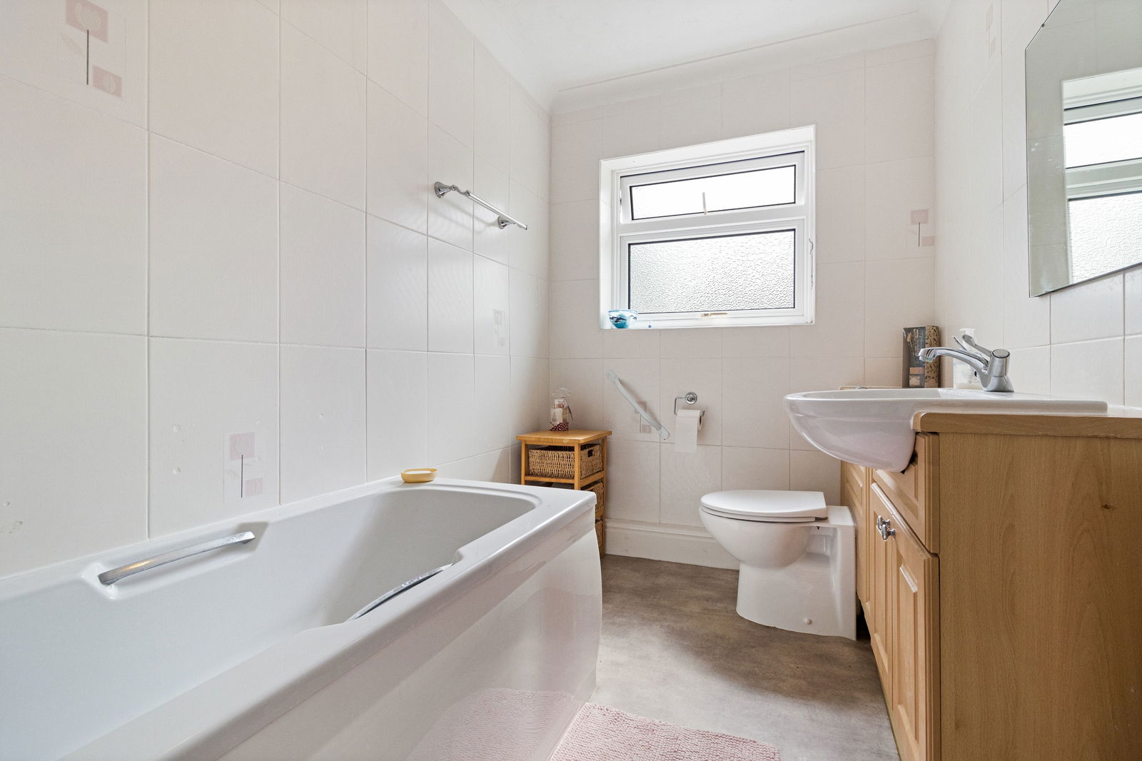 Vinyl floor, obscure double glazed window to rear, radiator, vanity wash hand and close coupled  WC with cupboard surround, tiled walls, ceiling light fitting, bath with electric shower over.