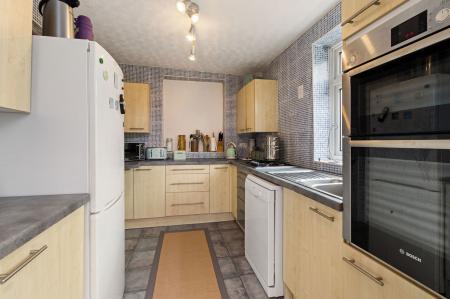 Vinyl floor, double glazed window to side, ceiling light fitting.  Range of base and eye level units with worktop over.  Mosaic tile effect walls.  One and a half bowl stainless steel sink with drainer and mixer tap.  Built in OVEN and GRILL, gas HOB, space for fridge freezer and dishwasher. Further cupboards with worktop over and door to