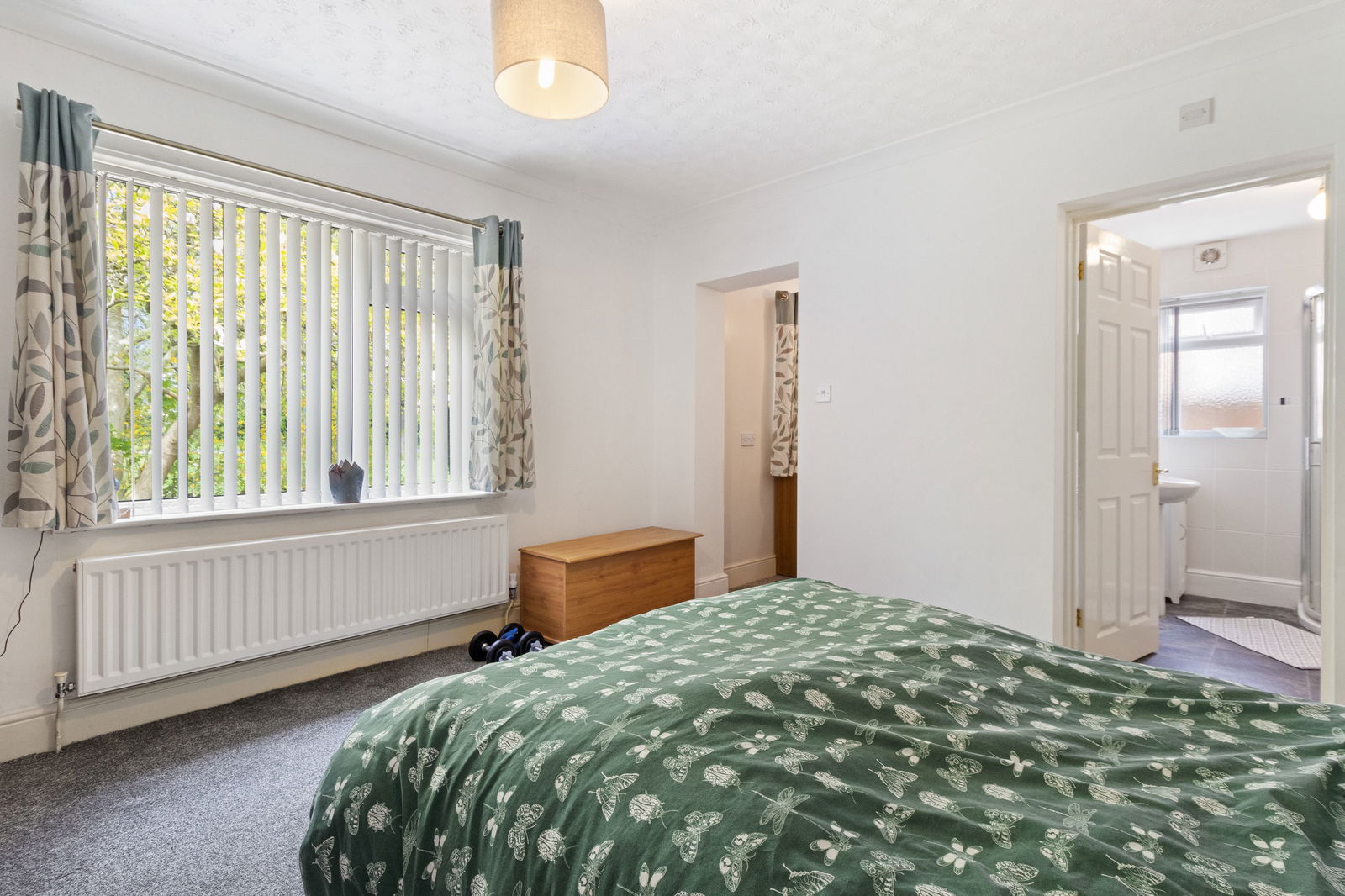 Carpet, double glazed window to front overlooking the foregarden, pendant light fitting, radiator, door to en-suite and open to