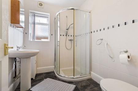 Vinyl flooring, tiled walls, ceiling light fitting, extractor fan, obscure double glazed window to side.  Corner shower cubicle with mains power shower, low level WC, pedestal wash hand basin with mixer tap.  Shaver point and radiator.