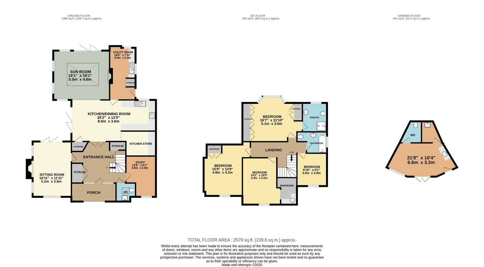 The accommodation offers flexible living with an open plan kitchen, dining and sun room with a separate sitting room with log burning stove, separate study, cloakroom, utility and boot room.  There is a lovely landscaped garden with a Garden Studio, Shed and Workshop.
