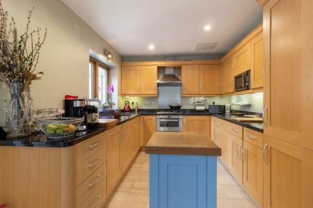 Range of base and eye level units with granite worktop over, built in OVEN and GRILL with extractor over.  FRIDGE and MICROWAVE.  Door to pantry.  Sound system Bi-fold doors opening from the dining area to a side patio.