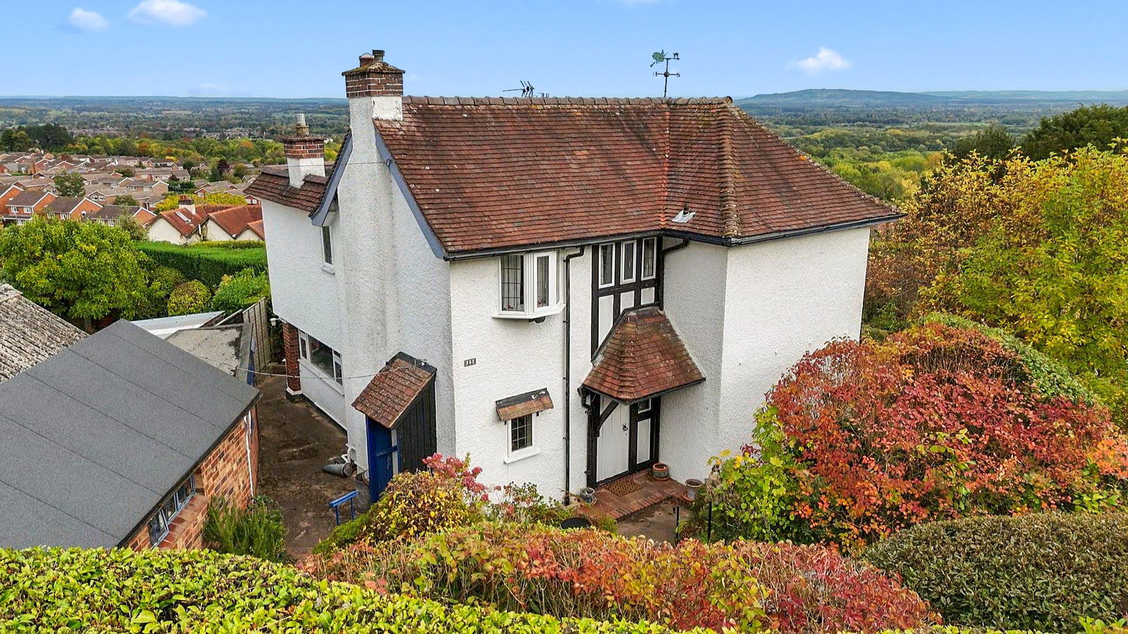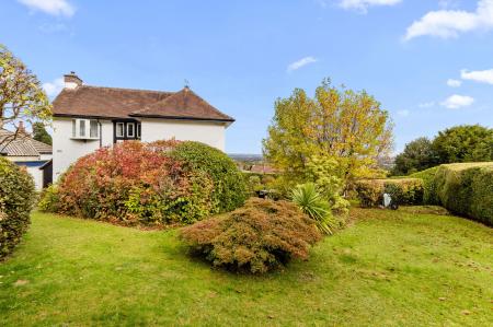 The property itself is sat in generous and established grounds and initially approached from the road by a single width driveway offers parking for a vehicle and gives access to the brick built single garage.  To the right of the driveway a wrought iron pedestrian gate open to a paved path that leads through the planted and lawned foregarden with mature plants and shrubs, enclosed by a hedged perimeter and affording fine views back to the hills. A short flight of steps descend to the beautiful, hardwood original front door set under a storm porch with pitched tiled roof, tiled floor and light point as well as an original ''pull'' doorbell.