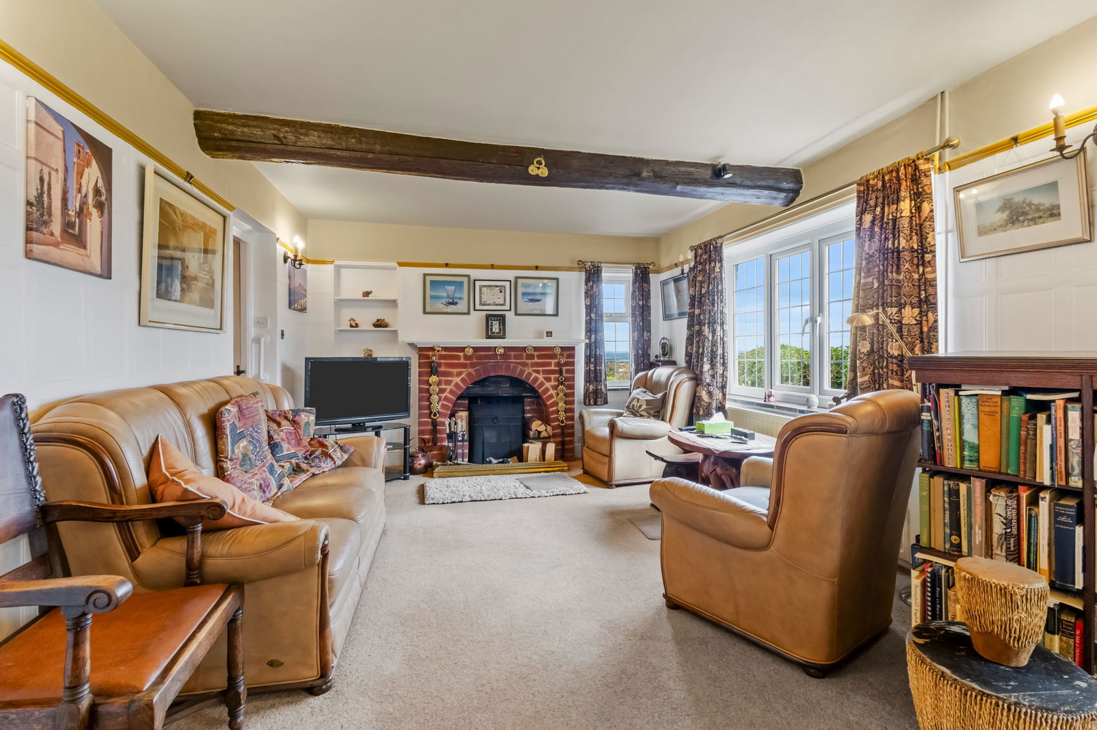 A generous, dual aspect room with double glazed windows, radiators.  The focal point of this room is the open fireplace with brick surround and mantel, open grate and tiled hearth.  Wall light points and door to