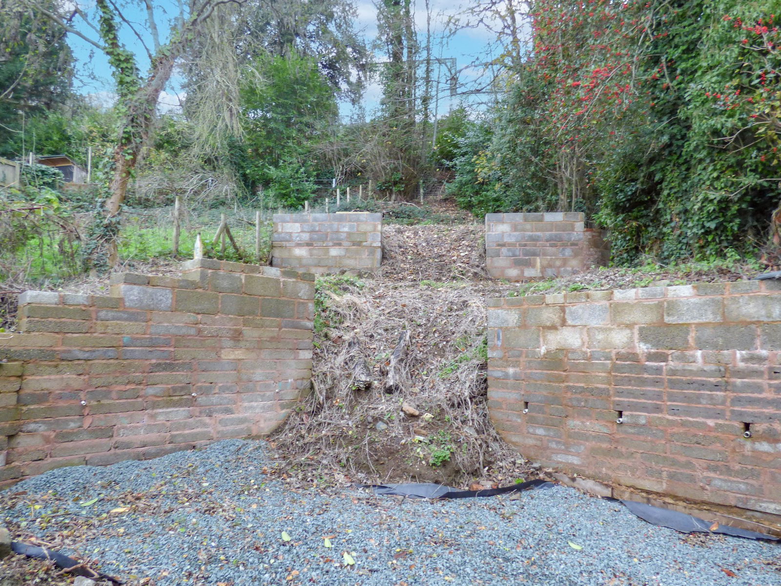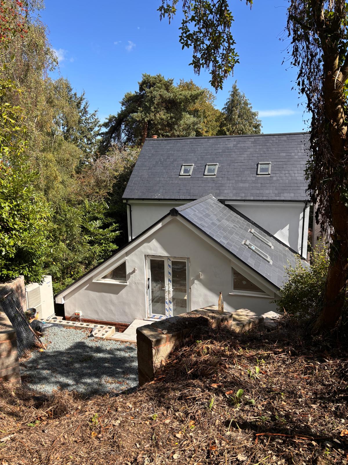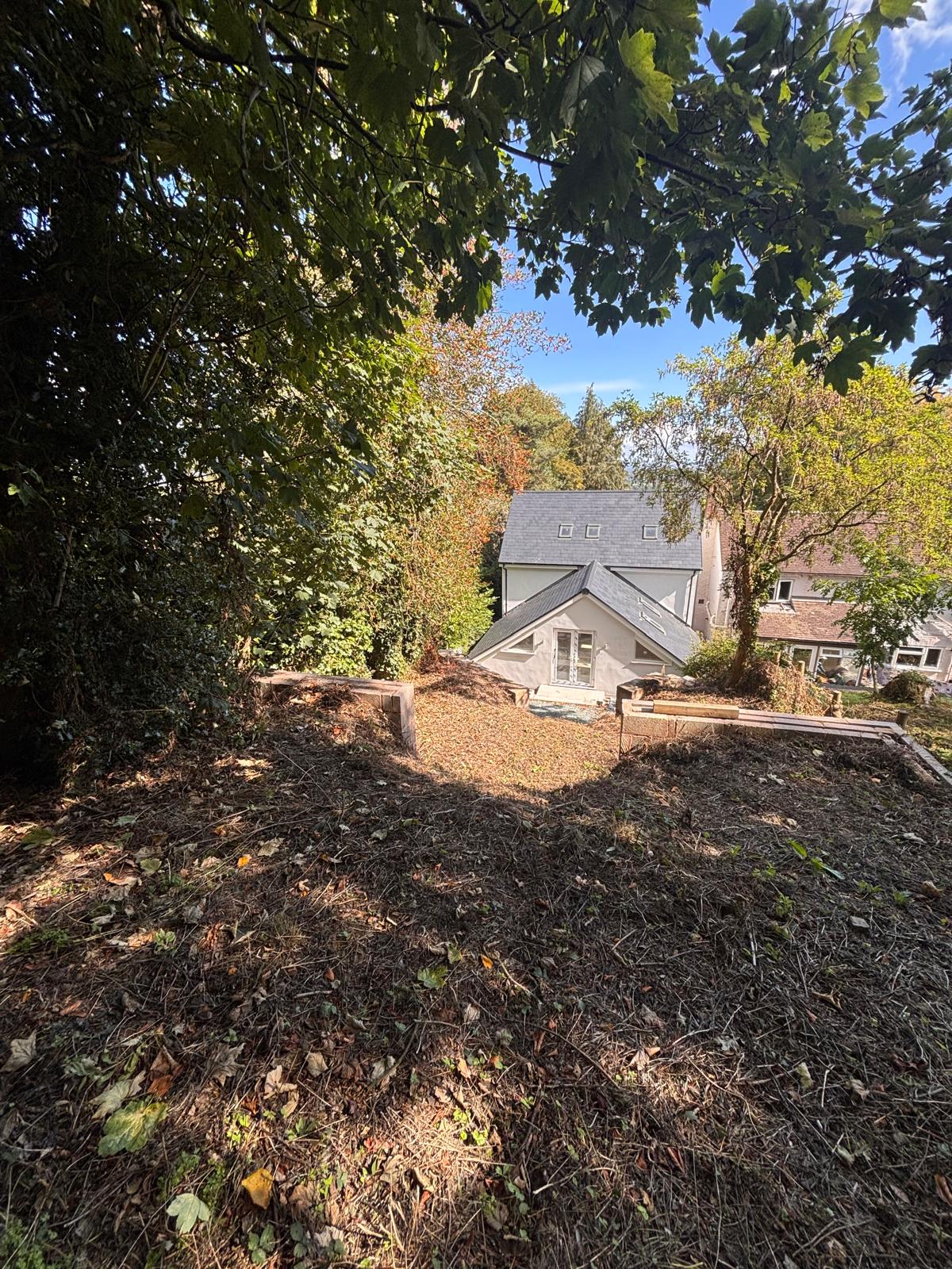 The garden is hillside with a gravel seating area accessed from the main living room and where balustrading will be added. The remaining garden has been set into two tiers which will be left for the occupier to make the garden their own, but with fenced and hedged perimeters.