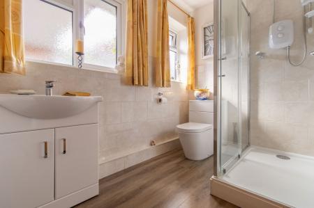 Karndean flooring, radiator, vanity wash hand basin, close coupled WC, partially tiled walls and tiled shower cubicle with electric shower. Ceiling light fitting, two obscure triple glazed windows to side. Wall light, door to airing cupboard housing the central heating boiler.