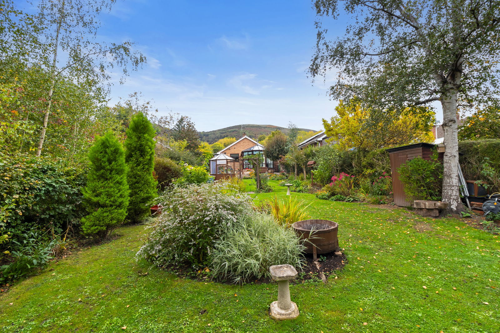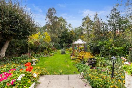 The rear garden has been beautifully landscaped and drastically improved by the current owners and offers a large than average, quarter of an acre, plot which can be accessed via the gravelled path to side, from the conservatory and from the breakfast room where steps lead down to a patio area ideal for entertaining or al-fresco dining. Steps lead down to a lawn with beautifully planted shaped borders that provide colour throughout the year. There is a SUMMER HOUSE with electricity and two SHEDS. The garden is split into two sections by a picket fence and gate and to the rear is a woodland area with a range of mature trees providing a private, peaceful setting. From the garden a view of the hills can be enjoyed. External lighting, power sockets and water tap.