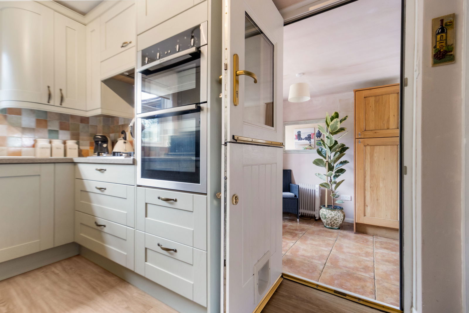 Karndean flooring, ceiling fitting, radiator. TV point. Range of base and eye level units with worktop over, partially tiled walls, triple glazed window overlooking the garden. Ceramic Franke sink and drainer, built in Neff eye level OVEN and GRILL, four ring Bosch gas HOB with extractor over. Space for washing machine and dishwasher and fridge freezer. Stable door opening to