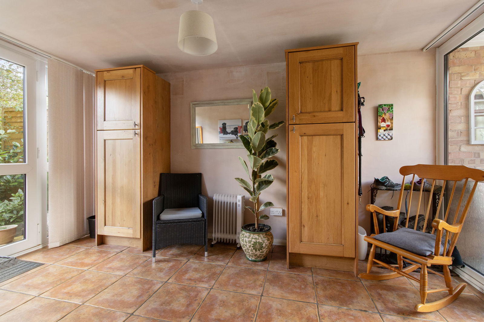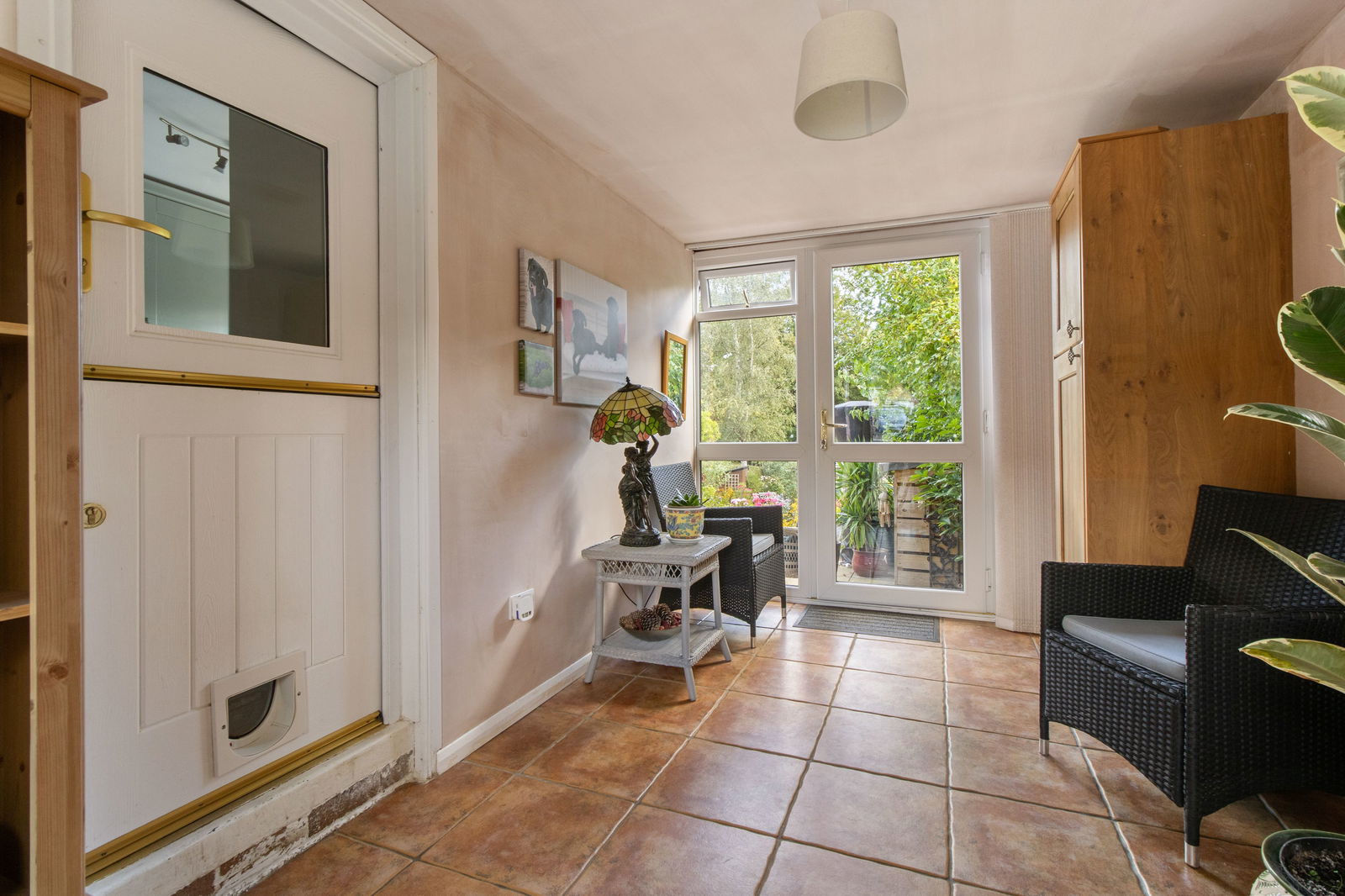 Tiled floor, pendant light fitting, triple glazed door with side panels to garden. Smoke alarm