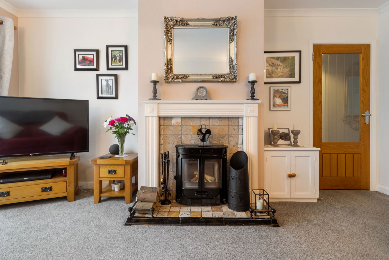 Carpet, two pendant light fittings, two wall lights, inset multi-fuel Sharnwood woodburning stove with tiled hearth and wooden surround. Built in table to side. TV point, radiator, smoke alarm, triple glazed French doors opening to the