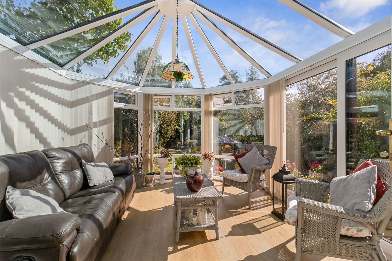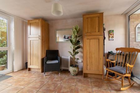 Ideal dining area, Karndean flooring, built of brick and triple glazing with bespoke fitted blinds and a wonderful view over the garden. Radiator, sliding patio doors to outside and tinted glass roof.