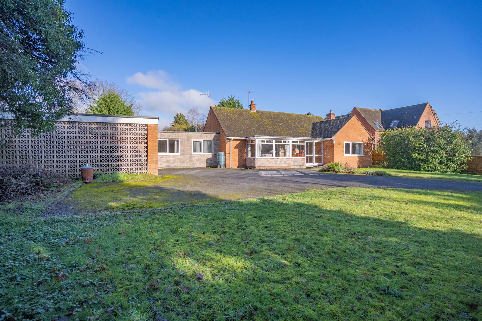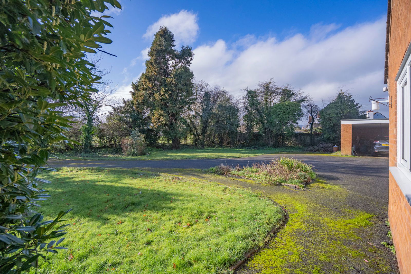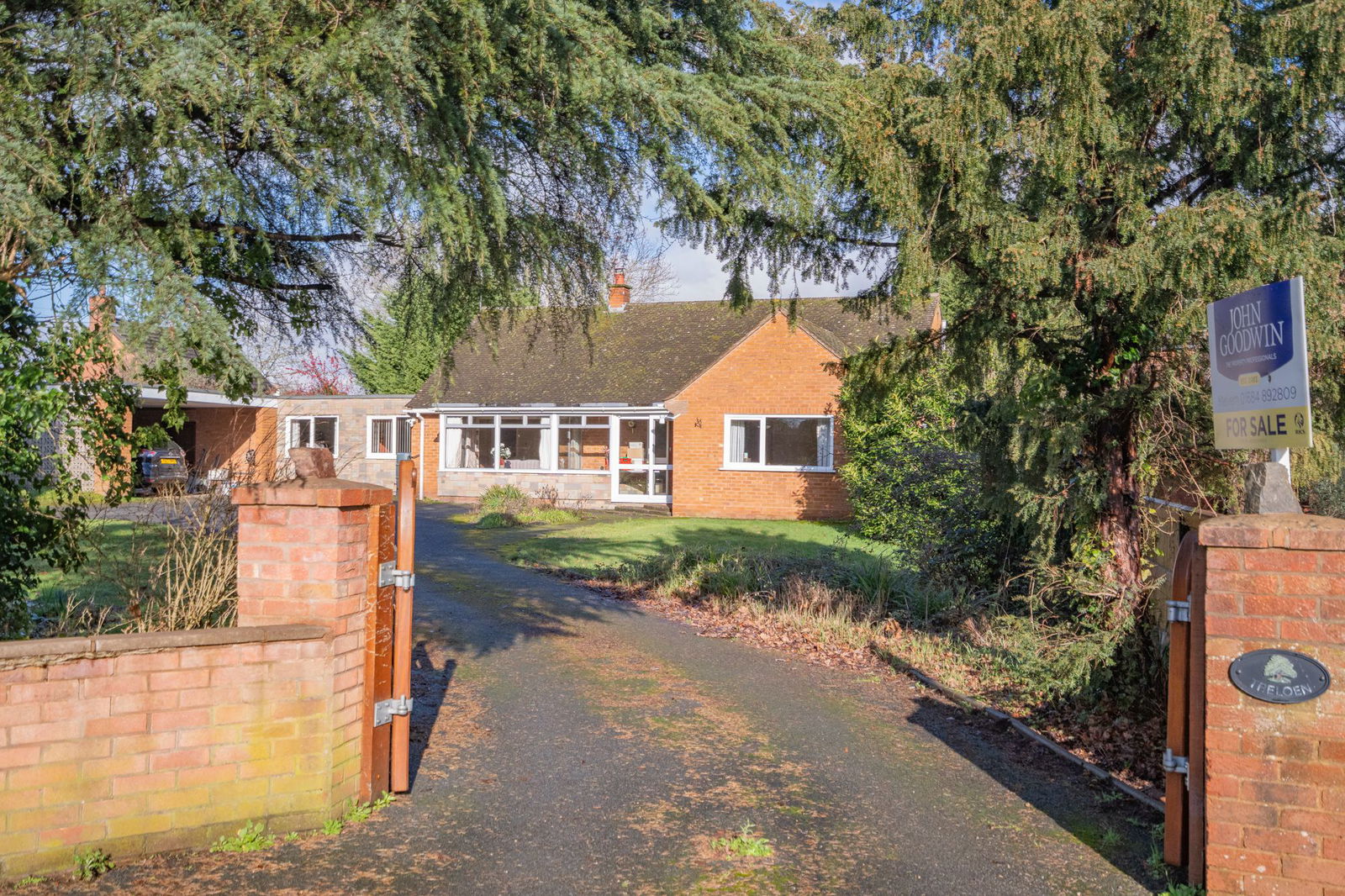 Treloen is a wonderfully positioned detached bungalow situated within this highly sought after village location of Hanley Swan.  The property is accessed from a small service road shared with the local pub and a few other properties.  Double wooden vehicle gates open to the driveway which continues to the front of the property opening to allow ample parking for vehicles and giving access to the double open bay car port.  The property is set back from the service road behind a mature hedged perimeter giving way to lawn, planted with a range of shaped beds and enclosed by a fenced and hedged perimeter.