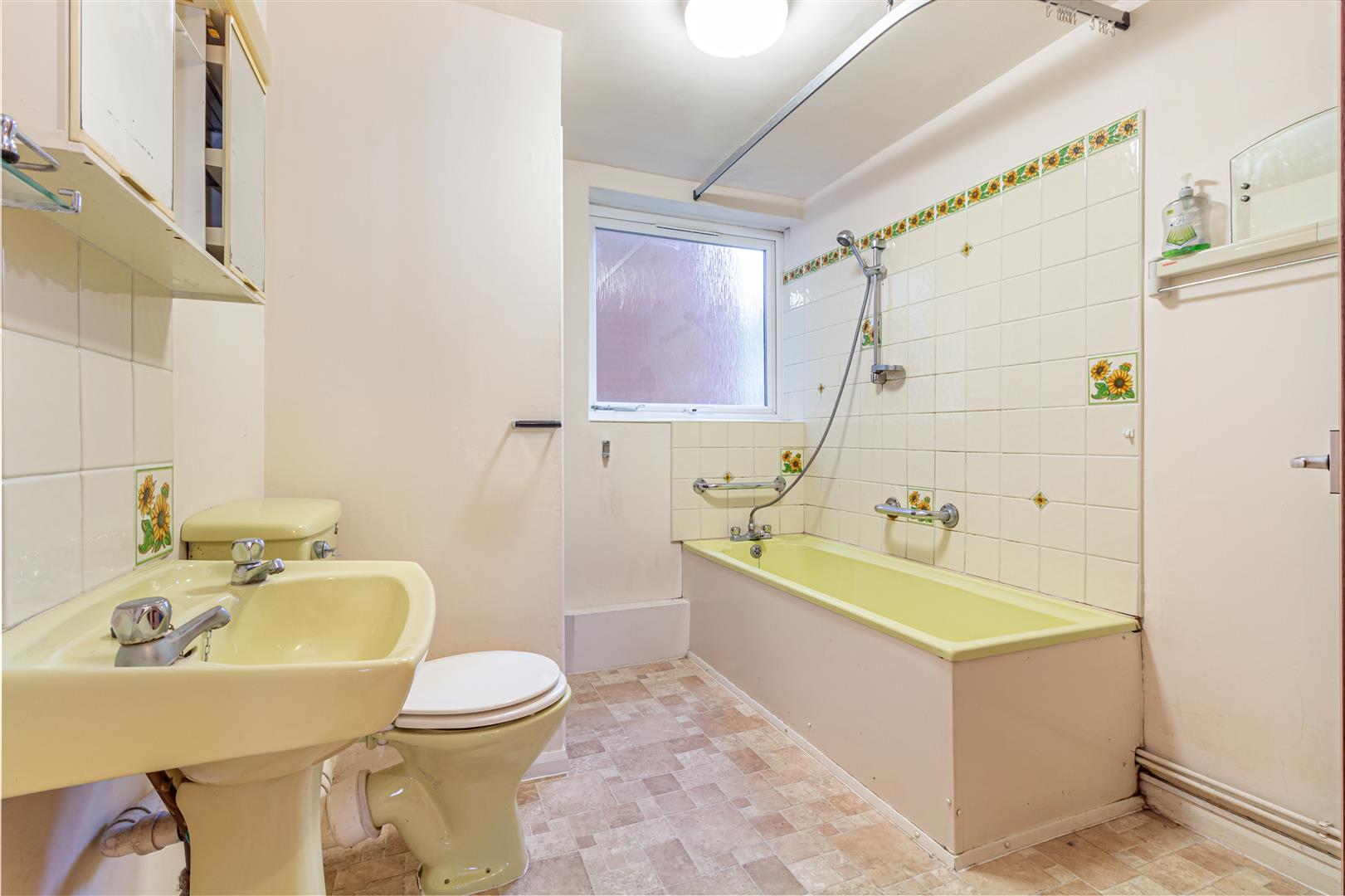 Wall shower attachment, pedestal wash hand basin and low level WC. Vanity cupboard with shaver point., Heated towel rail. Ceiling light point. Airing cupboard housing hot water tank and shelving.