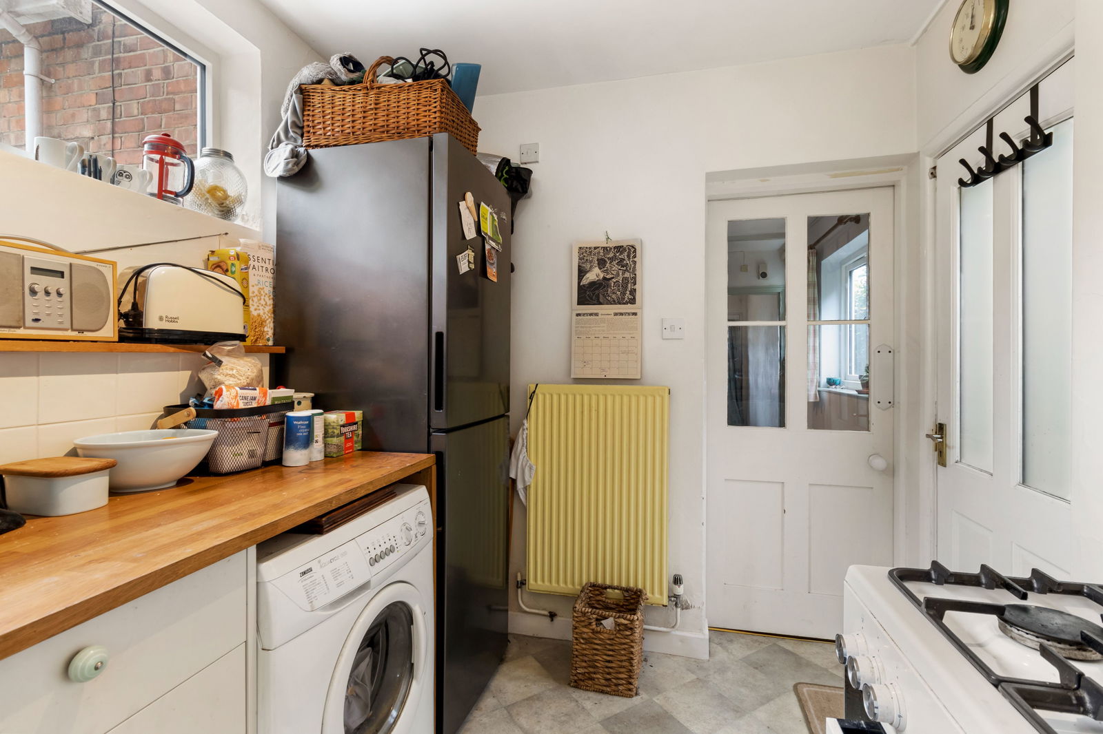 With three spot down lights. Double glazed windows to the read and side aspect. A double glazed door to the side access and garden. Base units with a wooden worktop and inset stainless steel sink and drainer unit with a tiled backsplash. Free standing gas cooker and four ring gas hob. Free standing Washing machine. Space for fridge freezer. Radiator. Vinyl flooring.