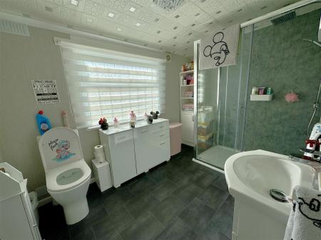 Shower Room - 3.07m x 2.06m (10'1 x 6'9) - Refitted to comprise of a large walk-in double shower cubicle accessed via sliding glazed screen with inset, overhead and detachable hand shower, laminate splashbacks, WC, vanity wash hand basin with mixer tap and cupboard below, heated towel rail, front aspect frosted window.