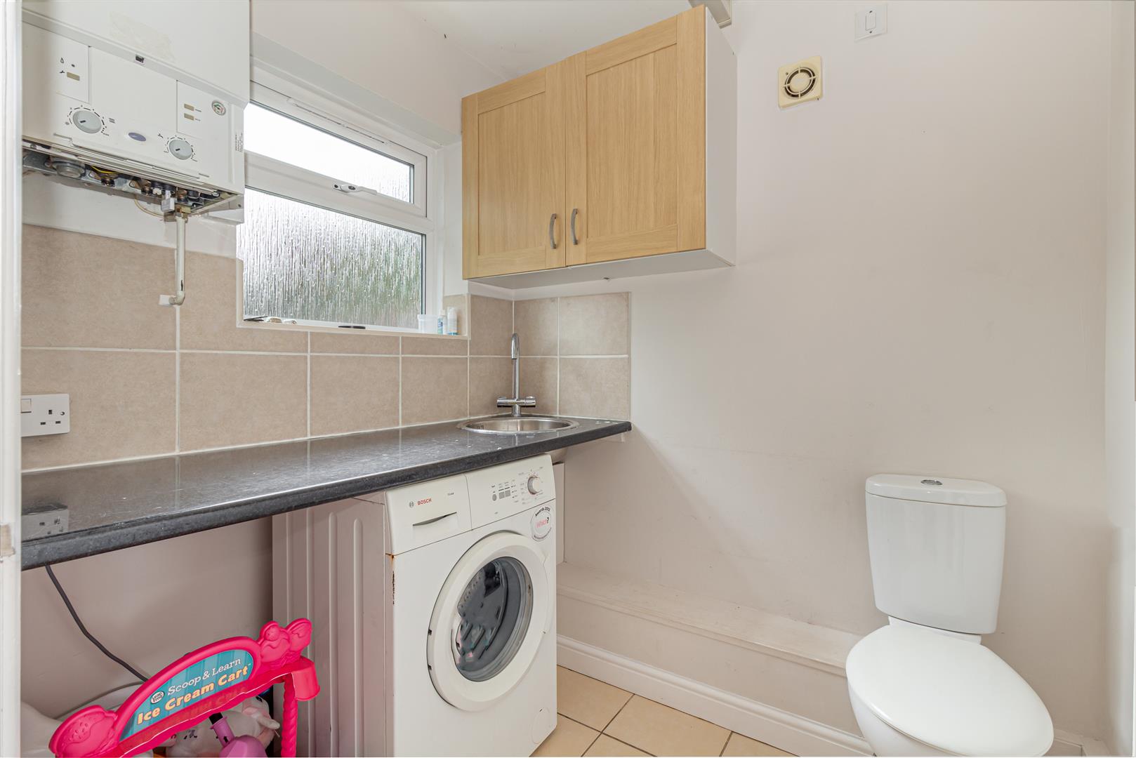 Low level WC. Radiator. Ceiling light point. Space and plumbing for washing machine and tumble-dryer. Housing Worcester Bosch combination boiler. Stainless steel sink with tap over. Tiled splashback. Mounted wall units. Double glazed obscure window to rear aspect.