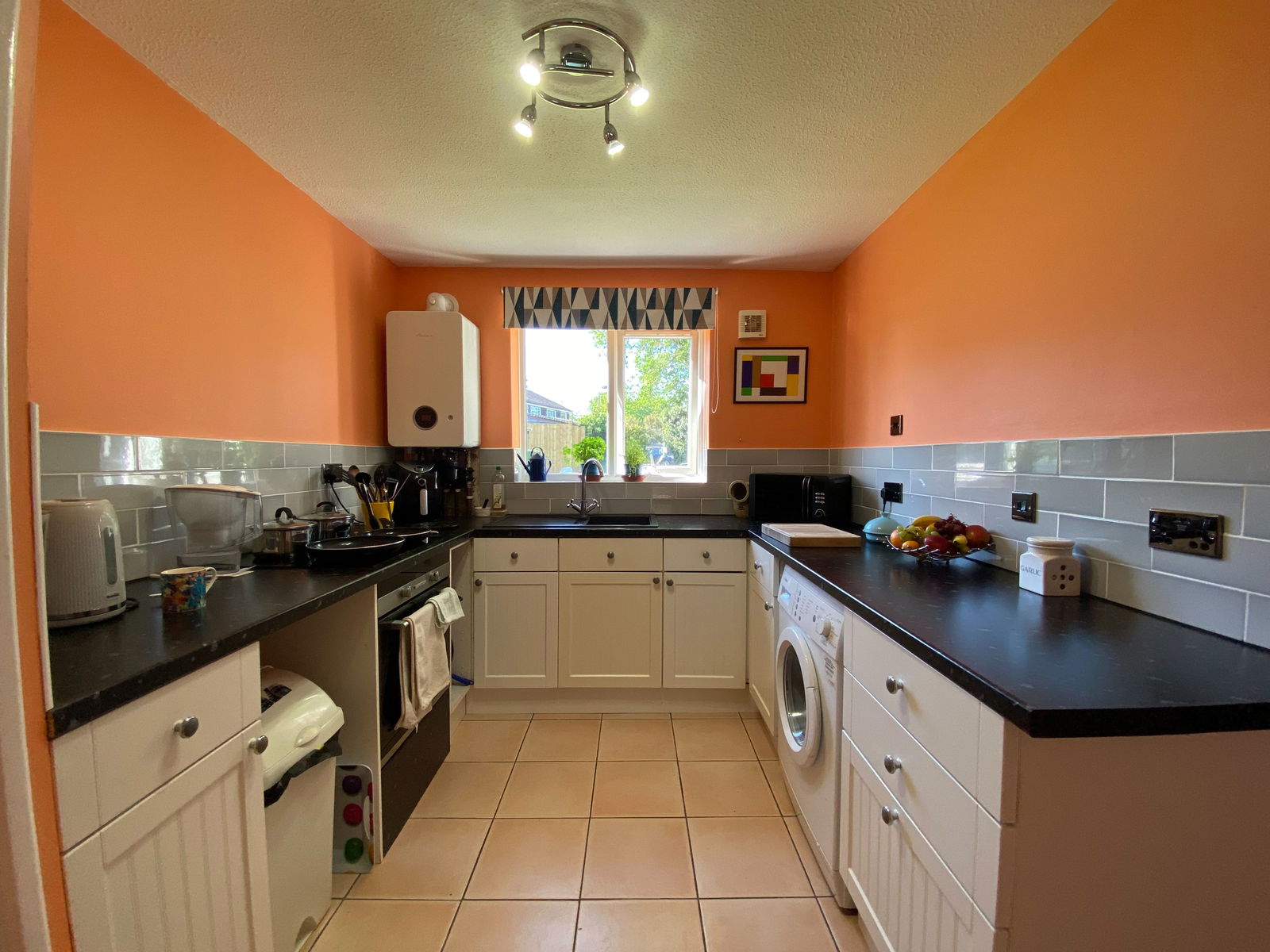 Tiled floor and partially tiled walls. Range of base level units with worktop over. Space for washing machine, built-in OVEN and Neff HOB, sink and drainer, double glazed window to the rear overlooking the garden, ceiling light fitting. Recently replaced boiler.