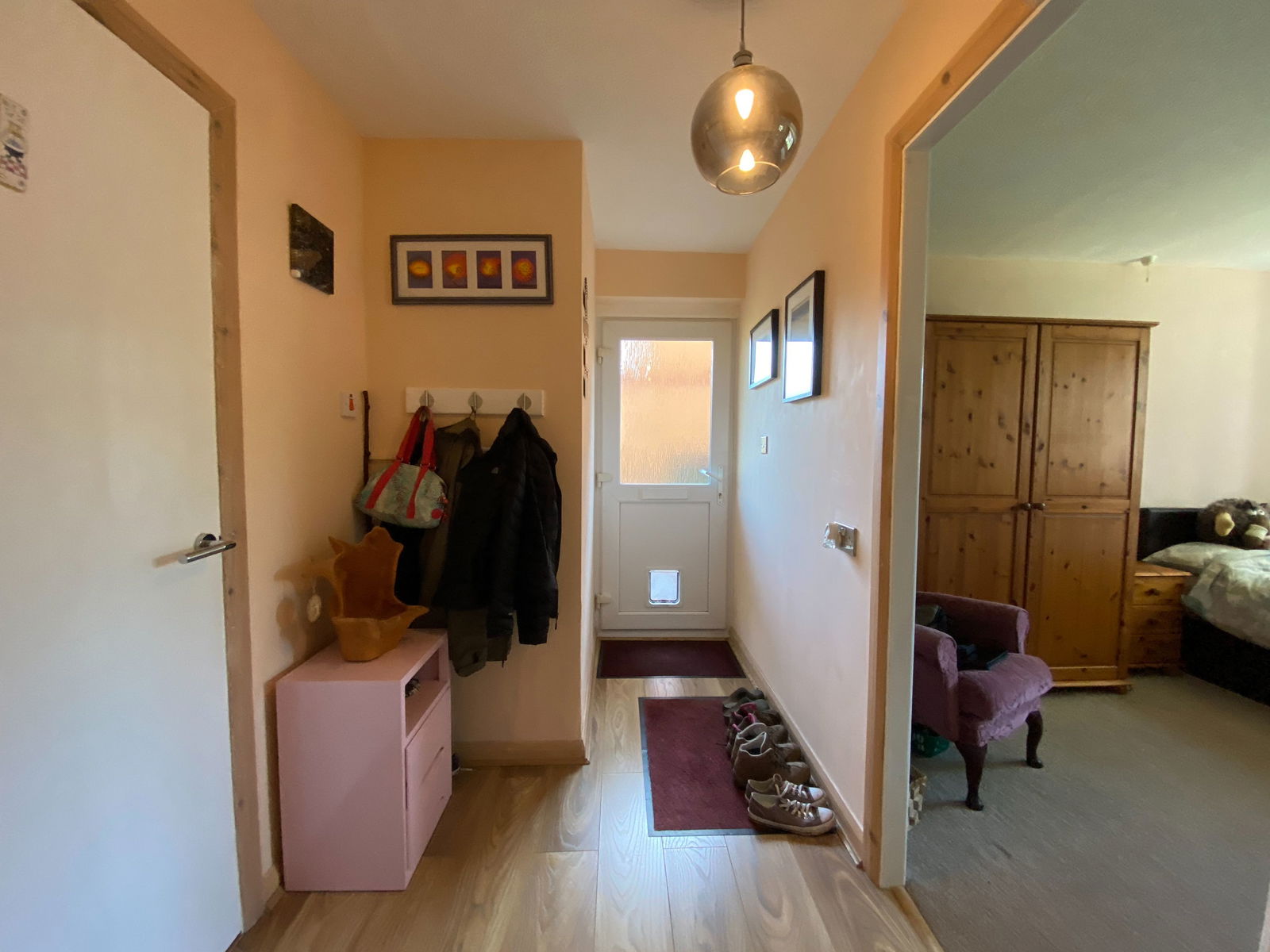 Laminate flooring, doors to bedroom, sitting room, bathroom, radiator, pendant light fitting, space for coat hooks.