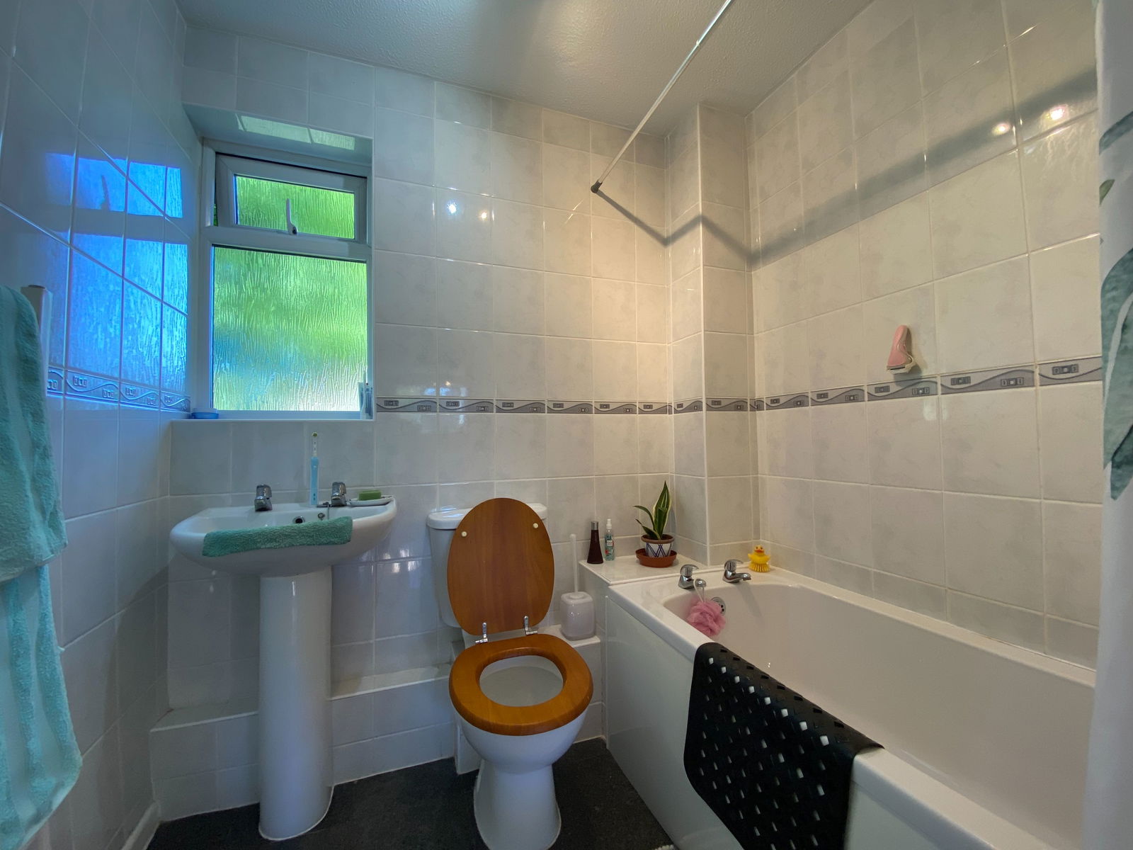 Vinyl tiled flooring, tiled walls, obscured glazed window to the front, heated towel rail, pedestal wash hand basin, close coupled WC, panelled bath with electric shower connected and ceiling light fitting.