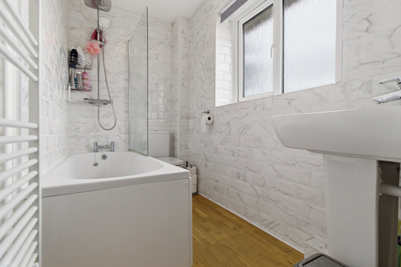 Wood effect flooring, tiled walls, close coupled WC, pedestal wash hand basin, panelled bath with shower over with waterfall setting. Obscure double glazed window, heated towel rail, ceiling light fitting. Airing with Worcester Bosch boiler.