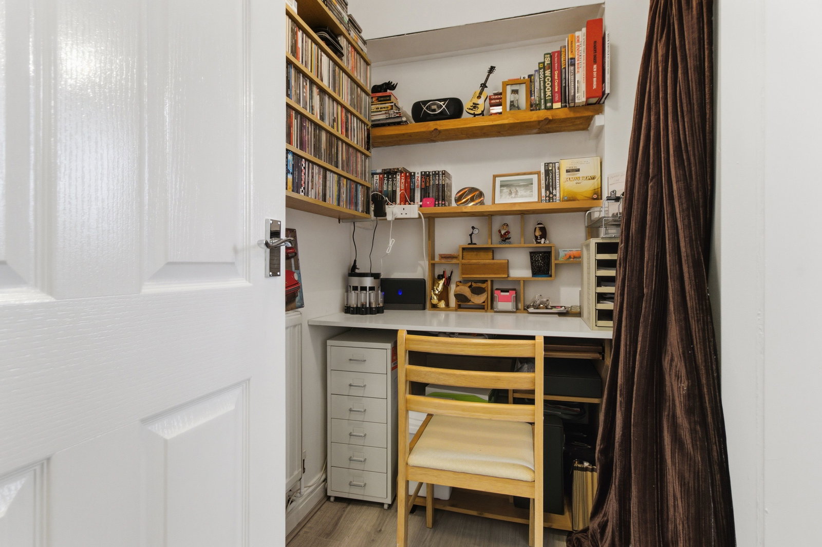 Vinyl flooring, built in desk, radiator, ceiling light fitting and open to the