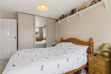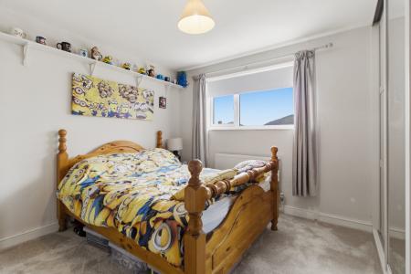 Carpet, double glazed window with view to the hills. Radiator, ceiling light fitting, built in wordrobes with mirror sliding doors.