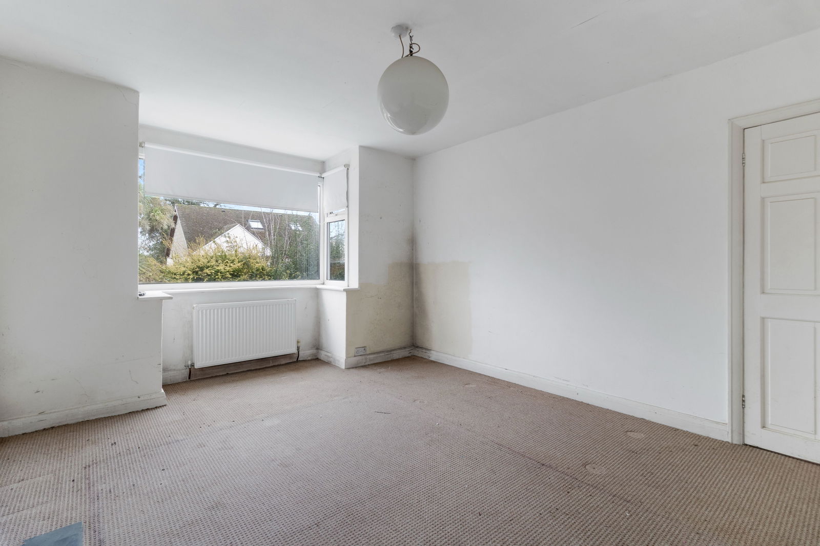 A lovely light room with carpet, ceiling light fitting, radiator, large double glazed window to the front.
