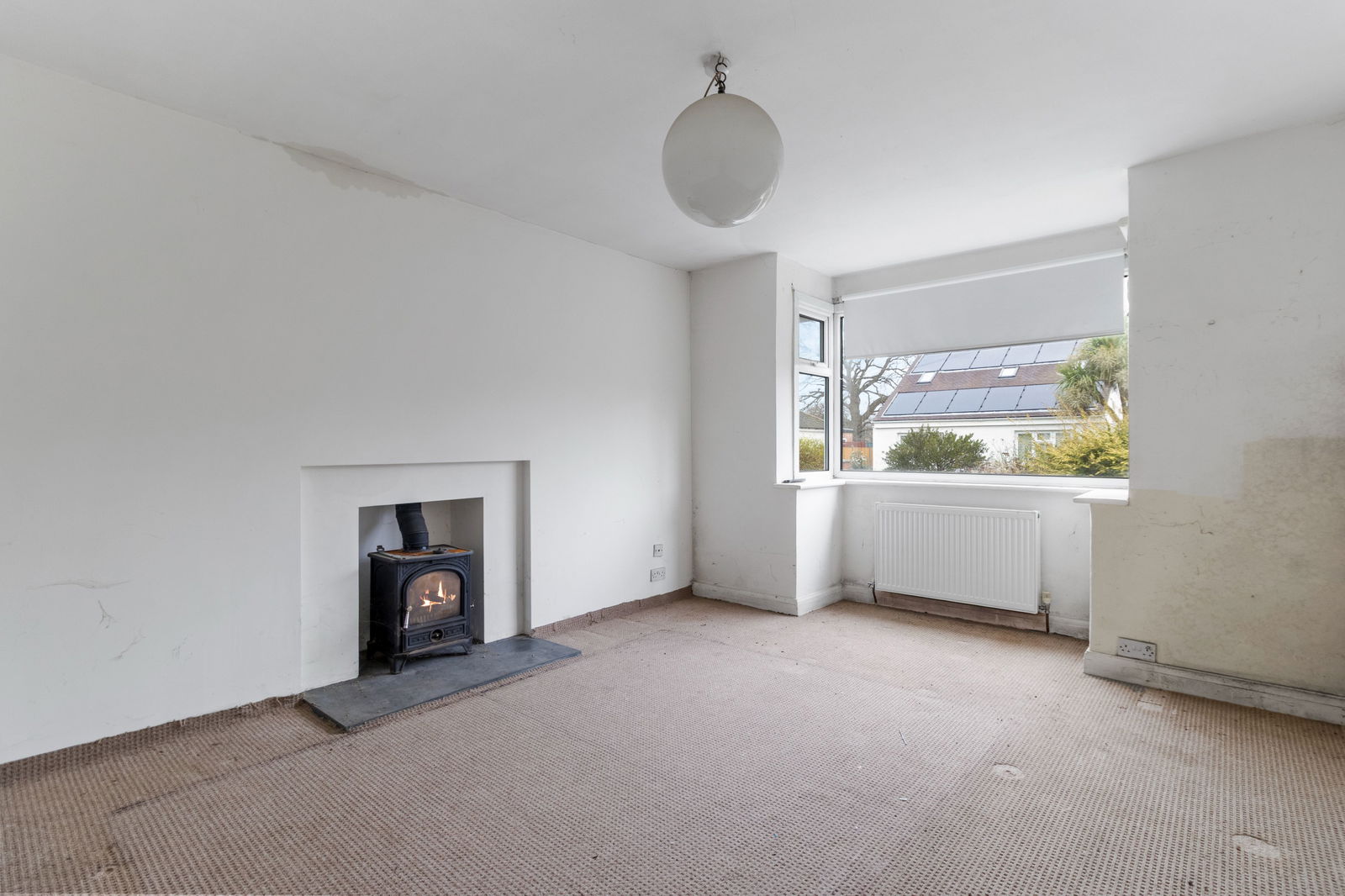 Carpet, double glazed bay window to the front, radiator, log burning stove with slate hearth, ceiling light fitting.