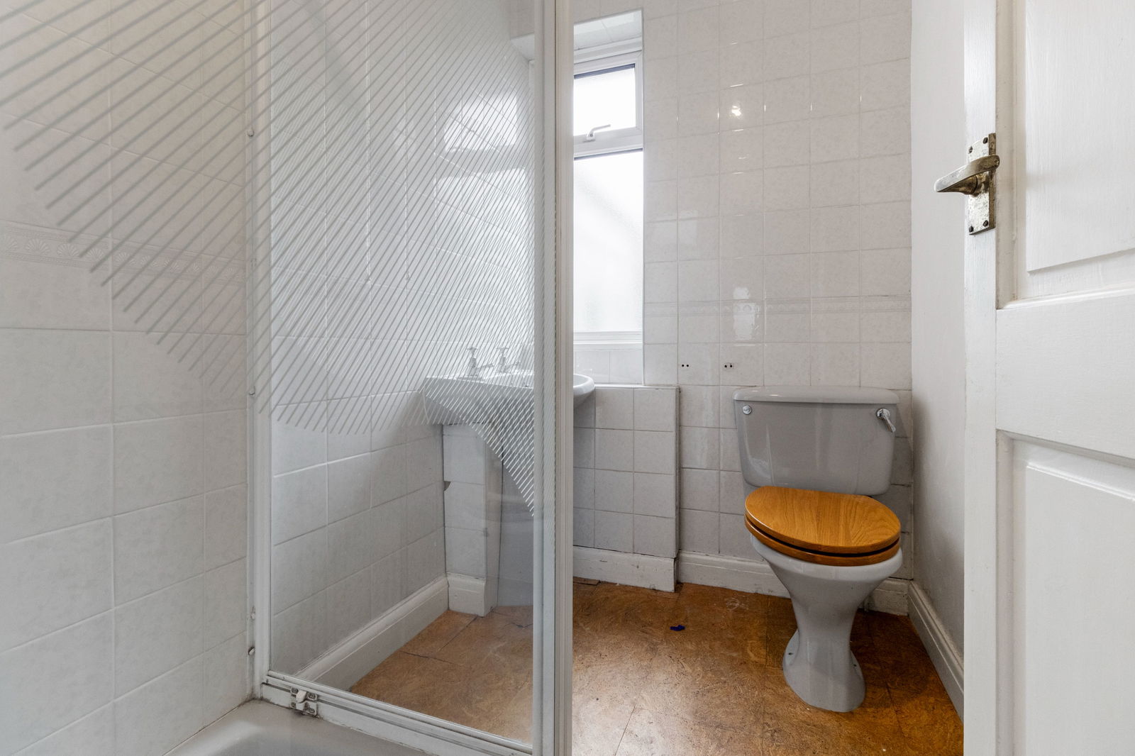 Tiled floors and partially tiled walls, close coupled WC, wash hand basin, shower cubicle.