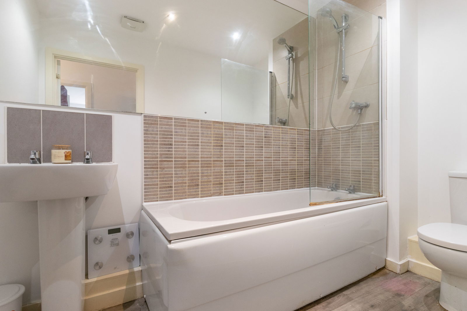 Vinyl flooring, partially tiled walls, close coupled WC, spotlights, panelled bath, shower connected, extractor fan.
