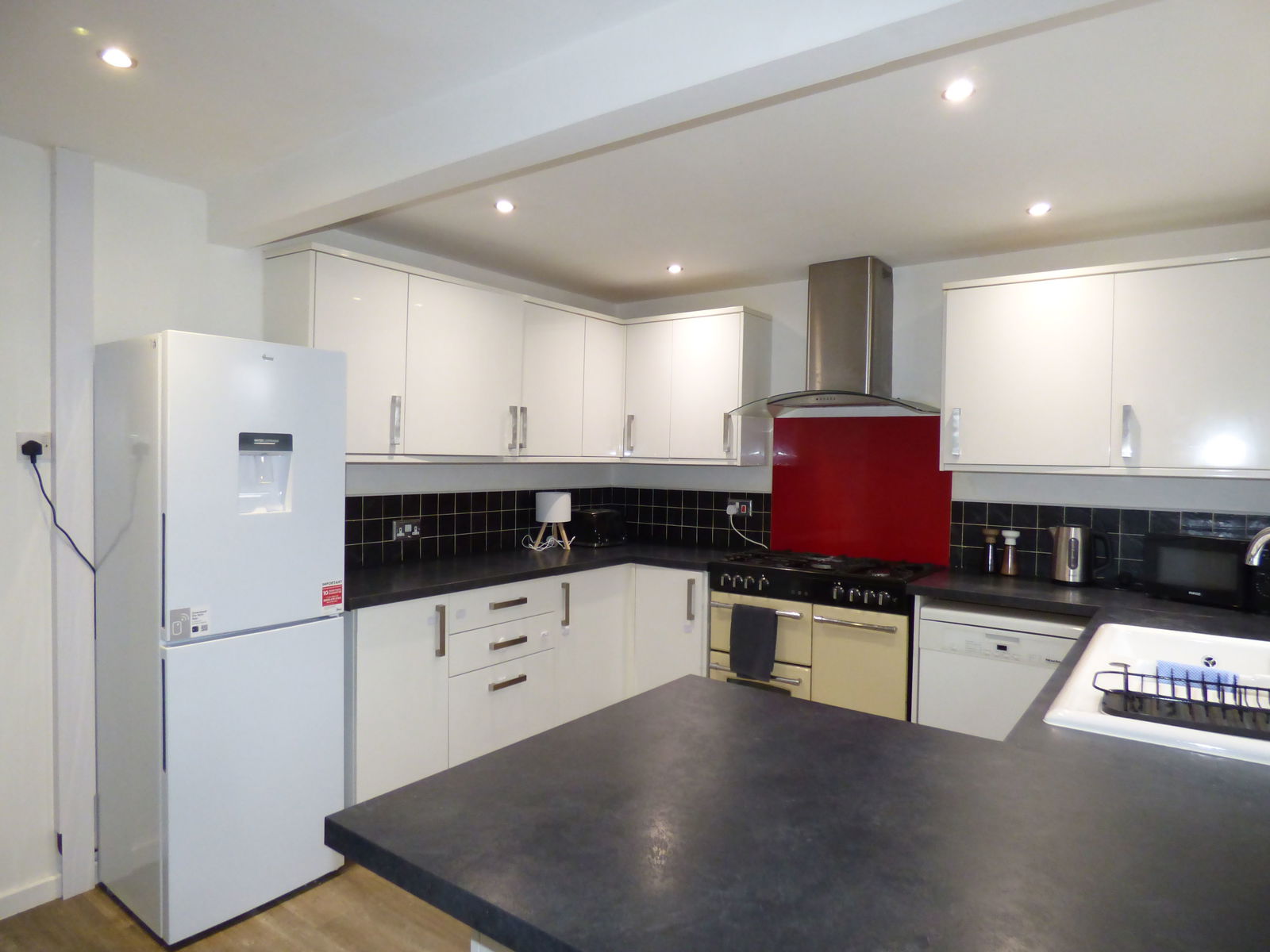 Positioned across the rear of the property and divided into two main areas the first of which is the kitchen fitted with a range of gloss fronted drawer and cupboard base units with chrome handles and worktop over. Matching wall units. A one and a half bowl ceramic sink with mixer tap and drainer is set under the double glazed window overlooking the rear garden. There is space and connection point for a range cooker with a stainless steel extractor over, undercounter washing machine point and full height fridge freezer. There is a breakfast bar style return with cupboards under dividing the kitchen from