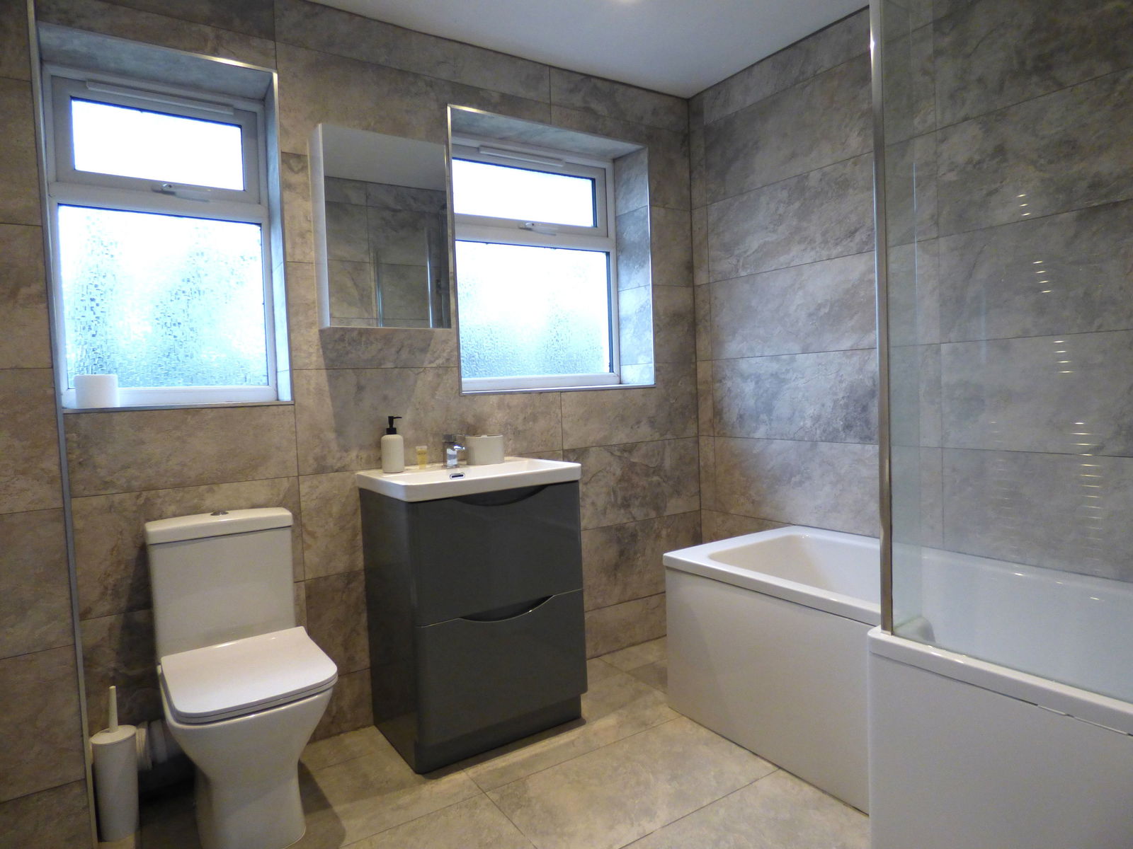Fitted with a modern white suite and consisting of a low level WC and vanity wash hand basin with mixer tap and drawers under. 'P' shaped style bath with thermostatic controlled rainfall style shower over with additional hand held unit. Walls and floor finished in complimentary tiling, chrome wall mounted heated towel rail, two obscured double glazed window to rear, inset ceiling spotlights.
