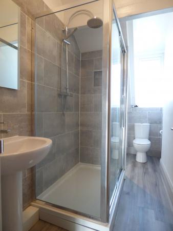 Fitted with a modern suite consisting of a white low level WC and pedestal wash hand basin with mixer tap, shower enclosure with thermostatic dual headed rainfall and hand held shower over. Splashbacks in complimentary tiling. A dormer window with views.